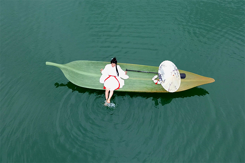 在永嘉书院百米碇步的碧波之上,“舟游世界”以两种全球首创的雕塑艺术船,将楠溪江的山水画卷升华为流动的诗意。国际艺术家博浩先生以“凤凰渡”传说为灵感,以凤凰羽毛与竹叶为形,打造出“凤羽”与“竹叶舟”两件水上艺术杰作,让游客化身画中人,演绎“舟行碧波上,人在画中游”的东方美学意境。