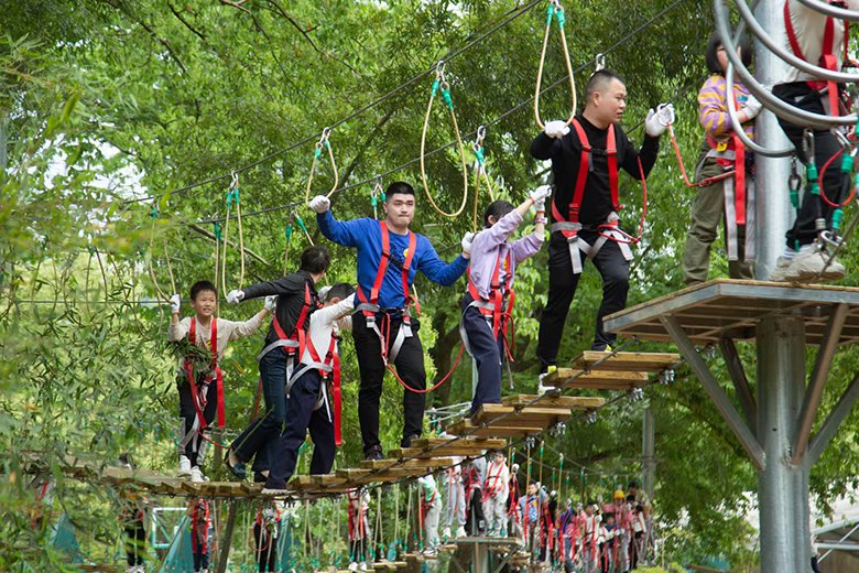 踏上第一关“交替前进”,需手脚并用跨越原木障碍,瞬间唤醒身体协调性;转战“绳网桥”时,蛛网般的绳索在头顶摇晃,每一步都考验平衡力;行至“泸定桥”仿制品,15米长的木板悬空而立,俯身抓索方能破浪前行。最受欢迎的是“绝处逢生”高空滑索,从树冠顶端俯冲而下,3秒疾驰间,恐惧化作肾上腺素飙升的快感。项目全程配备专业护具与教练指导,安全系数拉满。亲子家庭可选择低难度线路,在“轮胎桥”与“秋千桥”的嬉闹中增进默契;冒险爱好者则可挑战全线路,用征服“一线天”窄道、“晃板桥”摇摆的姿态,赢取专属“勇者勋章”。