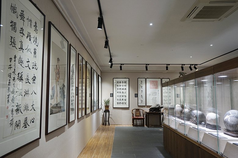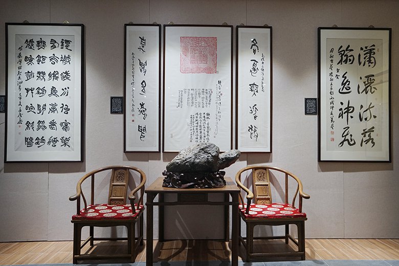 翰墨斋融楠溪山水灵韵与千年文脉于一堂,以亿年天然卵石为纸,名家翰墨为墨,演绎"天工造物,人文养心"的哲思。林林先生的行草作品以自然和谐的笔触,融诗人的洒脱与智者的超然于一体,再现中日书法交流的沧海桑田;陈中浙先生的对联以永嘉学派哲思为魂,笔力遒劲如楠溪古堰,对仗间尽显山水禅机。林剑丹先生的行书承袭温州"瓯江谣"笔韵,与陈振濂、刘艺等大家的墨宝共构"缺陷即圆满"的美学意境,在山水灵韵中对话千年文脉。七亿年瓯江石英岩的肌理与名家笔触交织,于方寸间见天地——赏石观字时,可见滩林烟雨化作宣纸留白,石桅朝圣凝成笔锋转折,这便是楠溪江独有的"山水入墨,文脉生辉"。