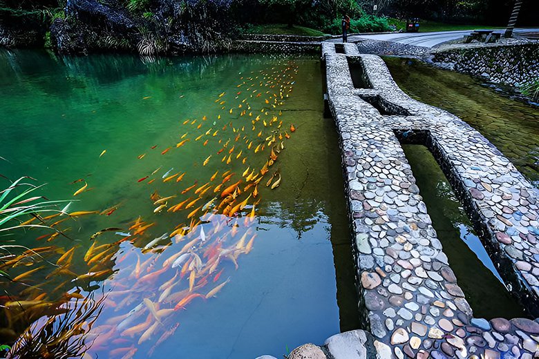 波浪桥是景区内最具灵动气息的景观桥梁,横跨清溪之上,以独特的波浪造型与自然山水完美交融。桥身由天然石块垒砌而成,蜿蜒起伏的线条宛如溪水奔涌的瞬间定格,白天阳光下泛着温润光泽,夜幕降临时则与星月倒影共舞。桥侧瀑布自山崖倾泻而下,水帘如纱幔垂落,激起的水雾与桥面微风呼应,营造出“人在画中行”的沉浸意境。