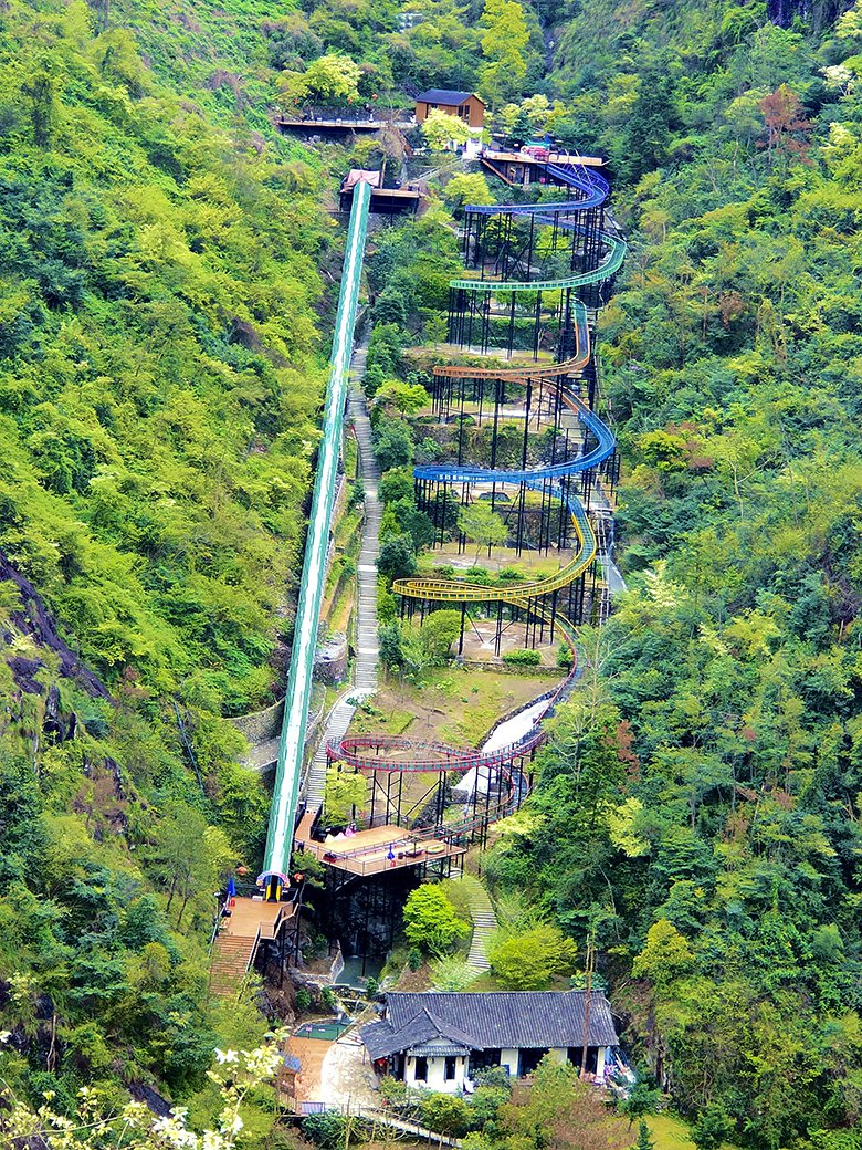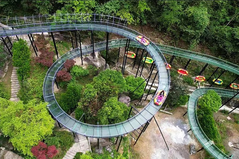 在永嘉书院的青山碧水间,金谷涧漂流以“飞天魔毯”与“高空玻璃漂流”两大核心项目,编织出楠溪江畔的惊险奇境。飞天魔毯如一条修长的银绸,300米长的轨道以100米落差蜿蜒而上,乘坐时仿佛乘云御风,缓步登临云端。脚下是渐次展开的峡谷画卷,远山如黛,近水含烟,让攀登的每一步都成为与自然的私语。而高空玻璃漂流则以1公里长的玻璃巨龙盘踞山谷,150米垂直落差与六个彩色圆环交织出魔幻轨迹。当气垫船俯冲而下,360度螺旋旋转中,疾风裹挟水雾扑面而来,炫目的色彩在眼前炸裂,恍若跌入异星秘境。时而贴壁疾驰,时而凌空飞跃,极速的失重感让尖叫与欢笑在峡谷间回荡,疾驰而下的瞬间,所有暑气与烦忧皆被涤荡一空。