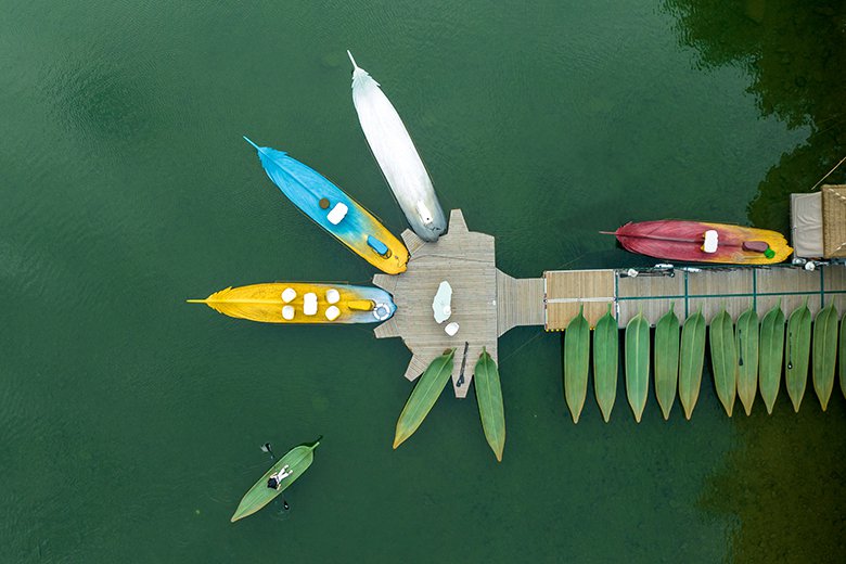 在永嘉书院百米碇步的碧波之上,“舟游世界”以两种全球首创的雕塑艺术船,将楠溪江的山水画卷升华为流动的诗意。国际艺术家博浩先生以“凤凰渡”传说为灵感,以凤凰羽毛与竹叶为形,打造出“凤羽”与“竹叶舟”两件水上艺术杰作,让游客化身画中人,演绎“舟行碧波上,人在画中游”的东方美学意境。