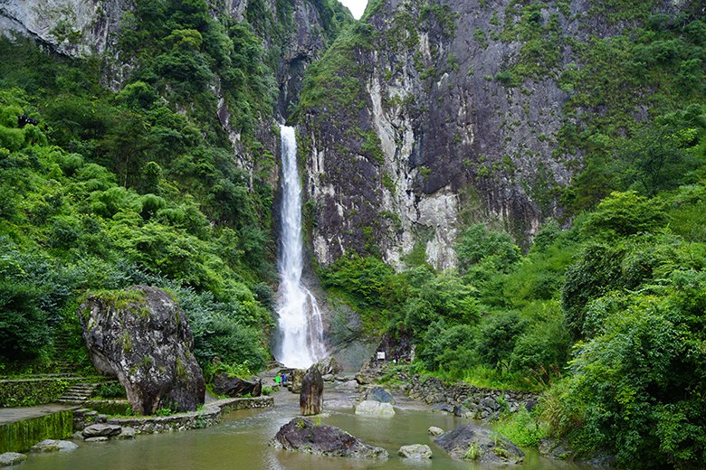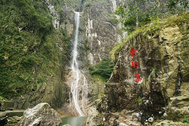 金珠瀑,以88米飞瀑悬练之姿傲立楠溪江峡谷之巅,四季清流不竭,盛夏尤显磅礴。其名取自白居易《琵琶行》中“大珠小珠落玉盘”的诗意——微风拂过瀑面,万千水珠凌空飞散,在阳光折射下如碎金迸溅,璀璨光影与轰鸣水声交织,绘就“金珠漫舞落九天”的视觉盛宴。